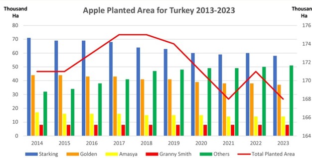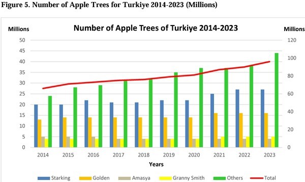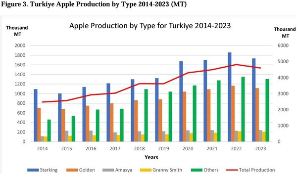 Production For the MY 2024/25 season, commercial apple production is forecast at 4.0 million metric tons (MMT), which is down 13 percent from last year's newly revised estimate due to unfavorable growing conditions in the major apple-growing regions. Some industry contacts are predicting production will drop even lower, while the Turkish Statistical Institute's (TUIK) forecast is more optimistic than both industry and Post. Meanwhile, MY 2023/24 production was adjusted lower based on the latest official data.