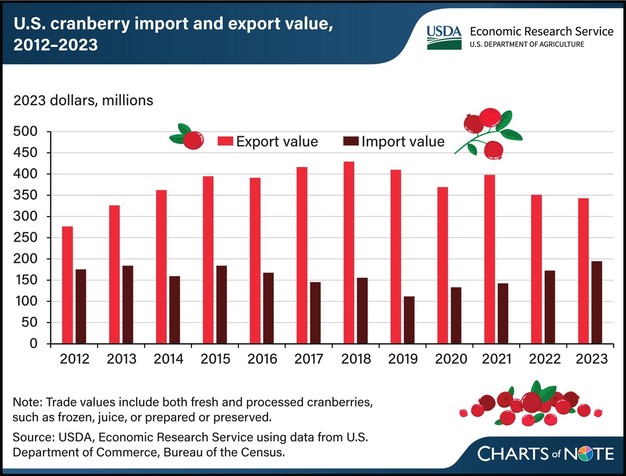 The United States produces about two-thirds of the world's cranberries, based on 2018–22 data from the Food and Agriculture Organization of the United Nations. In 2023, the United States exported $343.1 million of cranberries. Adjusting for inflation, the value of U.S. cranberry exports was 2 percent lower than in 2022 and $85.9 million lower than the 2018 high.