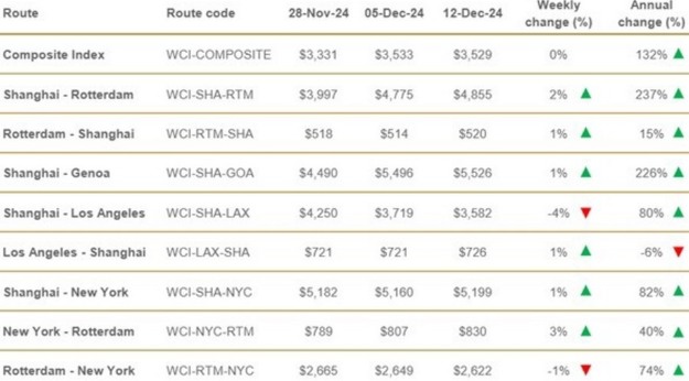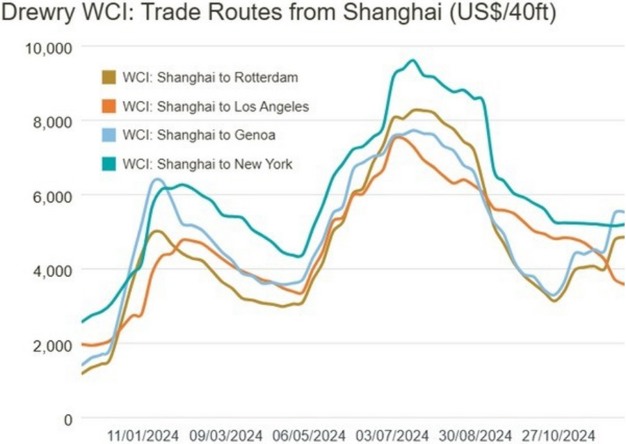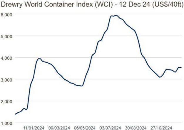 Freight rates from Shanghai to Los Angeles increased 26% or $917 to $4,499 per feu and those from Shanghai to New York increased 17% or $875 to $6,074 per feu. Likewise, rates from Rotterdam to New York inched up 3% or $91 to $2,713 per feu. On the other hand, rates from Shanghai to Genoa and Rotterdam to Shanghai decreased 2% to $5,424 per feu and $508 per feu, respectively, and those from New York to Rotterdam and Shanghai to Rotterdam shrank 1% to $824 per feu and $4,819 per feu, respectively, whereas those from Los Angeles to Shanghai remained stable. Drewry expects an increase in rates on the Transpacific trade in the coming week, driven by front-loading ahead of the looming ILA port strike in January 2025 and the anticipated tariff hikes under the incoming Trump Administration.