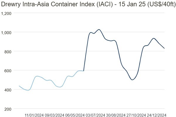 Drewry's Intra-Asia Container Index (IACI), a weighted average of regional spot container freight rates, fell 6% in the fortnight to 15 Jan 25 to $828 per 40ft container.