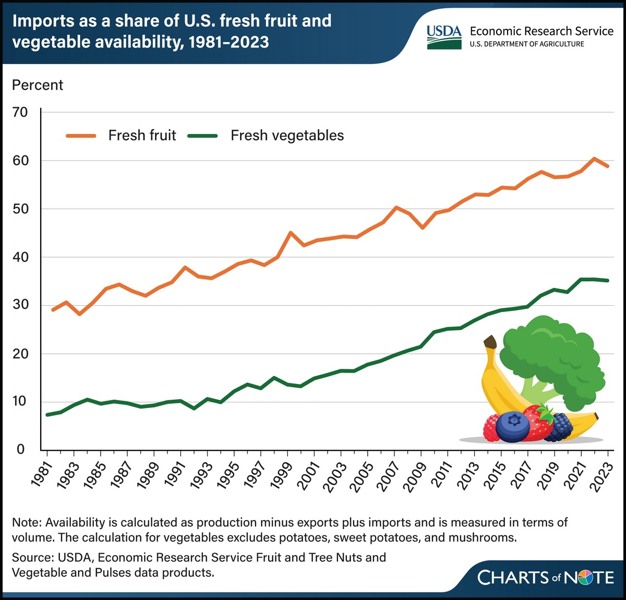 The increasing reliance on imports reflects broader trends in agricultural trade and consumer demand for fresh produce throughout the year. The USDA Economic Research Service (ERS) provides detailed data on these trends through its Fruit and Tree Nuts Data and Vegetables and Pulses Data reports.
