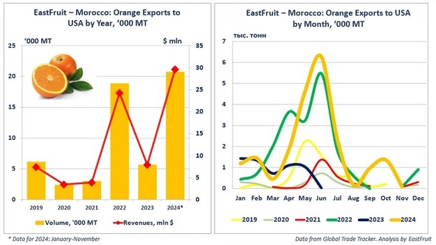 Morocco has resumed its orange exports to the USA, with the first 11 months of 2024 witnessing a record-breaking performance. According to EastFruit, over 20,000 tons of oranges were exported to the American market from January to November. This volume represents a 3.5-fold increase over the figures from 2023 and is nearly 10% higher than the previous record set in 2022. Additionally, export revenues reached a new peak at $29.6 million.