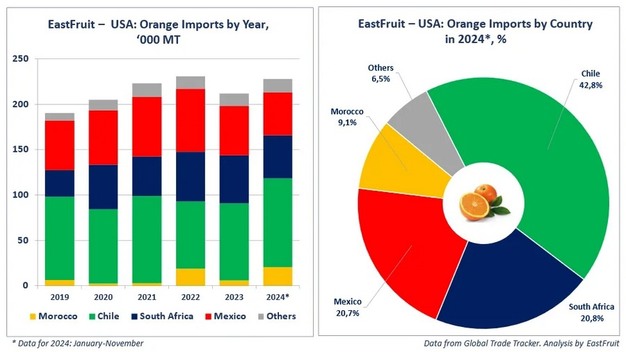 Chile, South Africa, and Mexico are the leading orange suppliers to the USA, collectively accounting for nearly 85% of the imports in 2024. Morocco has secured the fourth position with approximately a 9% share, maintaining this rank since 2022. Factors such as climate change, water shortages, and severe droughts have previously impacted Morocco's orange production, notably leading to a record low in exports in 2023.