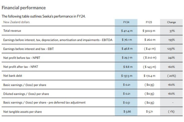 "Profit after tax was $8.8 million compared to a $14.5 million loss after tax in 2023. Seeka's financial results in 2024 include a $12.5 million one-off non-cash deferred tax charge due to the government's removal of tax deductibility of depreciation on buildings. Earnings per share, excluding the deferred tax adjustment, was 51 cents, compared with 2023's loss of 35 cents per share.