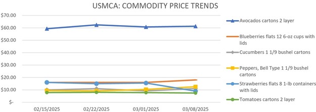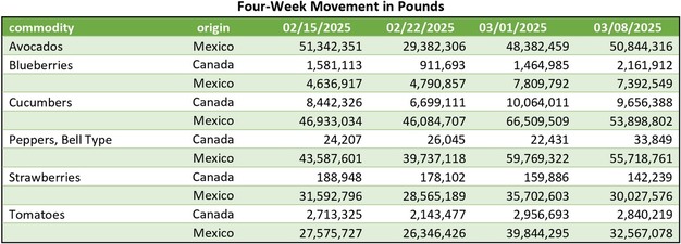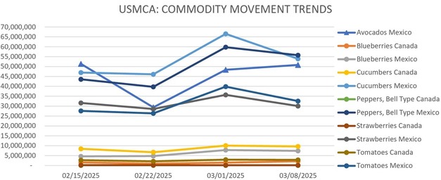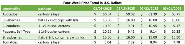 Produce movement and pricing across U.S. markets are showing mixed trends as import volumes shift and seasonal changes take effect. Avocado shipments from Mexico are increasing with varied pricing, while blueberry imports from Chile are rising and Peruvian volumes are beginning to taper. Strawberry movement remains steady but prices have dropped, and cucumber supplies from Mexico are climbing due to warm weather. Green bell pepper availability is stable, with higher prices noted across key shipping points.