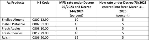 On March 31, 2025, the Government of Vietnam (GVN) issued Decree 73/2025/ND-CP, reducing the Most-Favored-Nation (MFN) import tariff rates on in-shell pistachios, almonds, fresh apples, cherries, and raisins. The decree takes effect immediately.