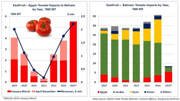 Egypt has expanded its export of fresh and chilled tomatoes to Bahrain, positioning itself as a key player in this market. EastFruit analysts report that Egyptian exporters sent 3,800 tons of tomatoes to Bahrain in 2024, reflecting a 50% increase from the previous year and a tenfold rise since 2022. In Q1 2025, Egypt exported 5,500 tons valued at $2.2 million, marking a 45% increase over the prior year.