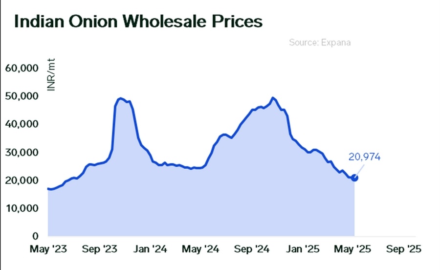 Most recently, on April 1, 2025, India lifted a 20% export duty on onions to address weak export demand and falling prices. However, as of May 28, 2025, onion wholesale prices, according to Expana's price series 6P52, recorded a 32.4% quarterly drop and a 15.1% year-over-year decline to INR 20,973 per metric ton (approximately $251/mt). The removal of the export duty has not sufficiently eased the onion oversupply to stop the price decline seen in April and May.