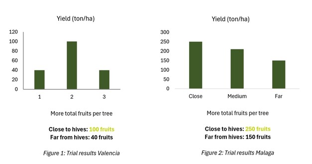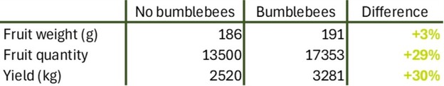 Field trials conducted in Spain and Turkey, in collaboration with academic institutions, showed that the introduction of bumblebee hives improved yield by 30–50% without reducing the average fruit size. In some cases, trees located close to hives produced more than twice as much fruit as those farther away. The results suggest that increased pollinator activity in orchards can enhance fruit set, potentially due to increased competition among pollinators.