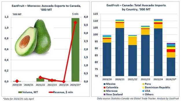 Morocco continues to expand its avocado export portfolio, reaching a record volume in shipments to Canada this season, according to EastFruit. Citing Global Trade Tracker data from Statistics Canada, Moroccan avocado exports to Canada during the first 10 months of MY 2024/25 (July–June) reached 1,180 tons, valued at $3.7 million. Given that previous exports to Canada had never exceeded 70 tons per season, this marks a significant milestone.