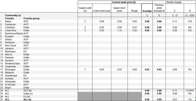 In contrast, both Colombia and Costa Rica reported no change in banana prices. For each country, the average price remained steady at £0.96, the same as their previous week's average. This indicates price stability in those markets for the week under review. No fluctuations were observed in the price range for these countries, with Colombia showing a price range of £0.07 and Costa Rica £0.20.
