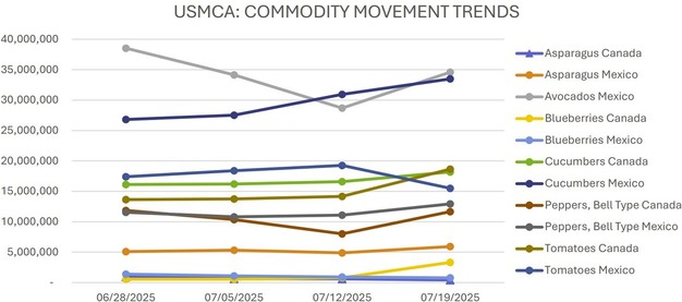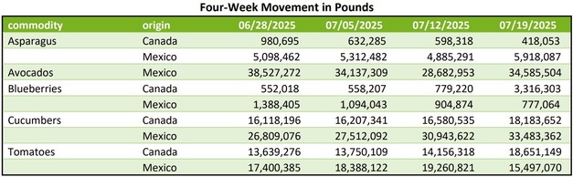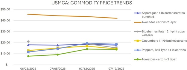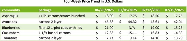 Movements of key fruits and vegetables across the U.S. continue with varying trading activity and price trends. Below is a summary of current conditions for asparagus, avocados, blueberries, cucumbers, and tomatoes.