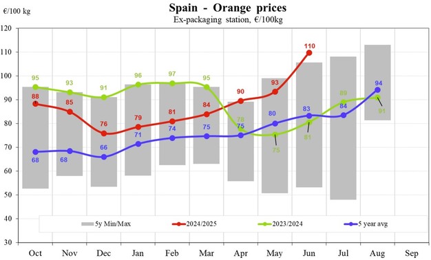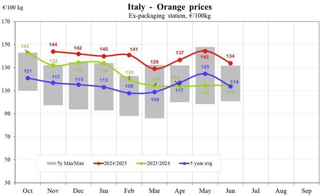 In Spain, orange prices continued their upward trend during the spring months of 2025, reaching €90/100 kg in April, €93 in May, and peaking at €110 in June. This surge places Spanish prices well above both the 5-year average and last season's figures, reflecting tight supply conditions and potentially strong demand during the late marketing season.
