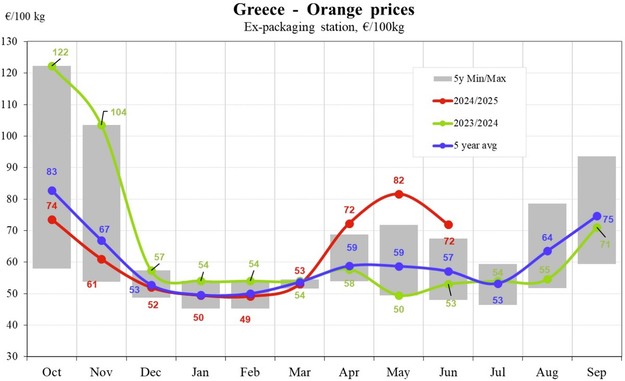 Greece experienced a more moderate price movement. In April 2025, oranges sold for €72/100 kg, rising to €82 in May before dropping back to €72 in June. Despite this brief rally, prices remained close to seasonal norms and below the highs recorded in 2023/2024.