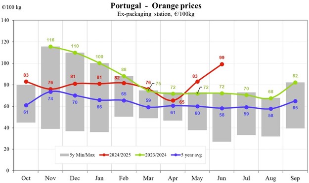 In Portugal, prices rose sharply across the spring period. From €65/100 kg in April, they jumped to €83 in May and climbed further to €99 in June. This marks a notable recovery compared to last season's figures, positioning Portugal as one of the stronger performers this year among southern European orange producers.