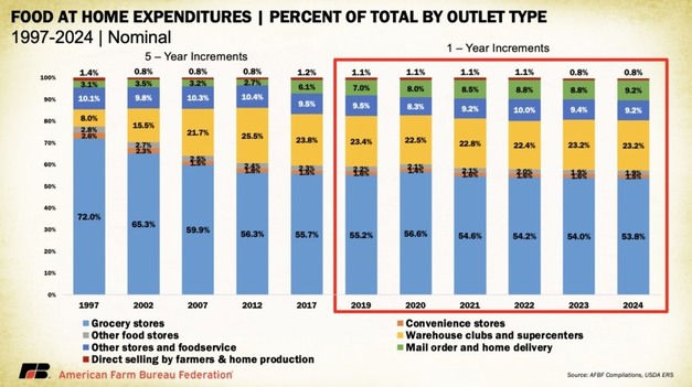 In dollar terms, grocery store expenditures grew from US$270 billion in 1997 to US$587 billion in 2024, an increase of 118%. Warehouse club and supercenter expenditures rose from US$25 billion to US$253 billion, a 911% increase, while food delivery climbed from US$9.8 billion to US$100.5 billion, up 924%.
