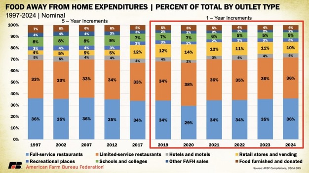 Limited-service and full-service restaurants each account for about 35% of away-from-home spending. During the pandemic in 2020, limited-service outlets reached 38% compared with 29% for full-service, due to drive-through and app-based ordering. Retail and vending grew from 4% of away-from-home spending in 1997 to 10% in 2024.