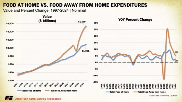 The USDA Economic Research Service (ERS) Food Expenditure Series tracks U.S. food and beverage spending, distinguishing between food consumed at home and away from home. Between 1997 and 2024, food-at-home expenditures increased from US$363 billion to US$1.091 trillion, while food-away-from-home spending rose from US$336 billion to US$1.539 trillion. Away-from-home spending overtook food at home in 2002, remaining higher except during the Great Recession and the 2020 pandemic.