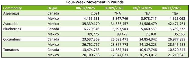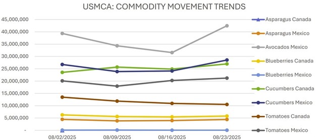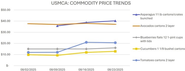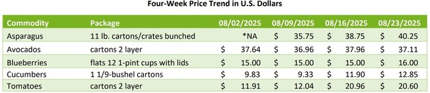 USDA market reporting shows varied trends across asparagus, avocados, blueberries, cucumbers, and tomatoes. Trading conditions remain mixed, with prices fluctuating across origins and sizes.