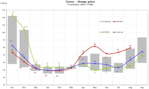 In Greece, the seasonal price pattern was different. After a dip in early 2025, the 2024/2025 line climbed steadily during summer, reaching €72/100kg in June, €74 in July, and €80 in August. These values kept prices within the 5-year band and above last season's levels, indicating a gradual recovery in the Greek market.