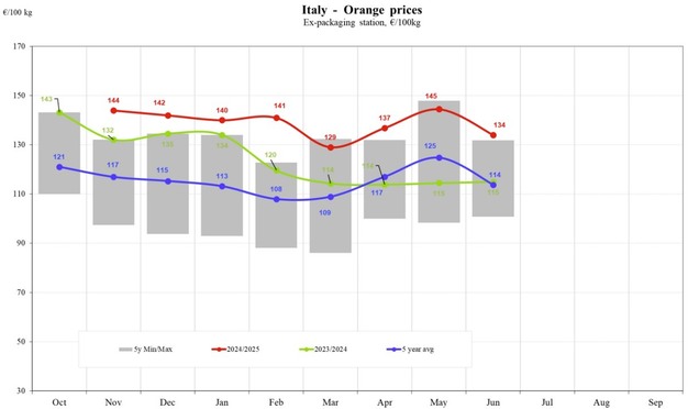 Italy continued to show the highest price levels among the four countries. In June 2025, Italian orange prices stood at €134/100kg for the 2024/2025 season. Data for July and August were not yet available, but throughout the season, Italian prices remained well above the 5-year average, reflecting a consistently stronger market compared to other producing countries.