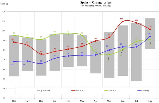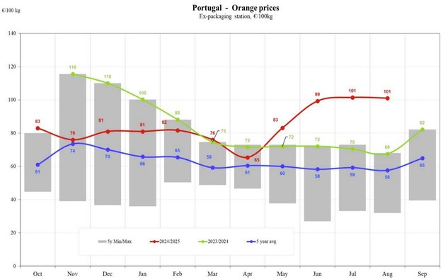 In Portugal, orange prices for 2024/2025 also climbed through the summer. The June level was €99/100kg, followed by €101 in both July and August. This placed Portuguese prices well above the 5-year average and higher than last year's levels, pointing to firm demand in the domestic and export markets.
