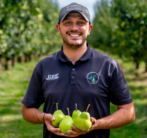 Travis Georgopoulos manages 607 hectares of apples and pears for his family's GVIP Orchards in the Goulburn Valley, Victoria. Around 30% of their production is delivered to export markets. The orchards grow Williams, Packham, Beurré Bosc, Corella, and Josephine pears, as well as the early Red Sienna Pride® variety bred by Travis's brother James. Certified organic since 2020, GVIP also produces Gala, Granny Smith, ANAPB 01 (marketed domestically as Bravo® and internationally as Soluna™), and high-coloured Cripps Pink cultivars.