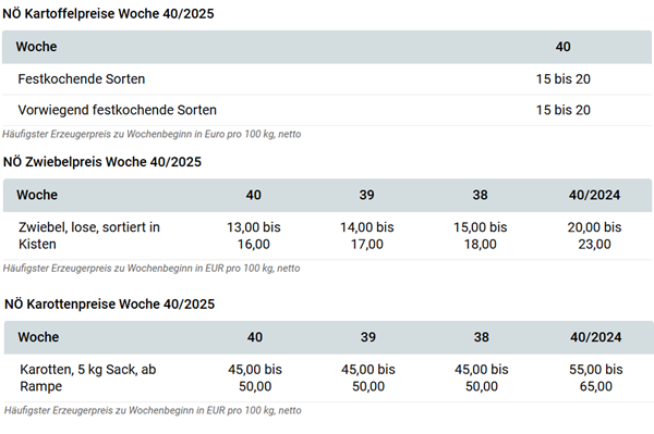 The domestic table potato harvest has been repeatedly interrupted in recent days due to weather conditions. This has somewhat alleviated the shortage of storage crates. In the first regions, harvesting is now nearing completion; in the later growing areas, however, the harvest is likely to continue until the end of October. The warehouses are already well stocked. Overall, a good average harvest is expected, although wireworms are likely to reduce the net yield again this year. Demand is currently satisfactory. Promotions in food retail are ensuring good sales, and there are also sales opportunities in exports. Prices remain unchanged from the previous week. In Lower Austria, up to EUR 20/100 kg is still being paid for good-quality onions, with deductions for temporary storage and higher logistics costs still being charged. In Upper Austria, the price level remains stable at EUR 20/100 kg.