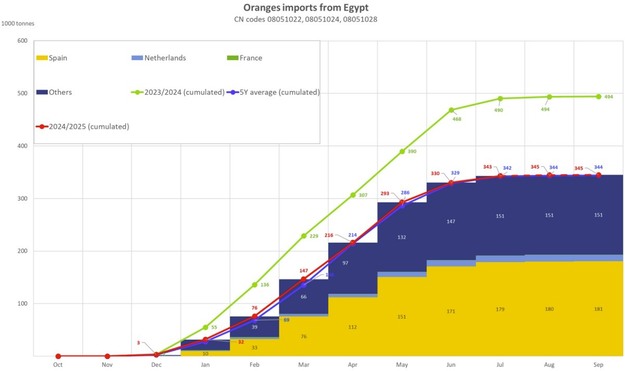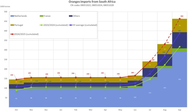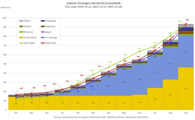 EU orange imports from October 2024 to September 2025 reached 934,334 tons, nearly identical to the 933,497 tons recorded in 2023/24 and slightly above the five-year average of 897,146 tons.