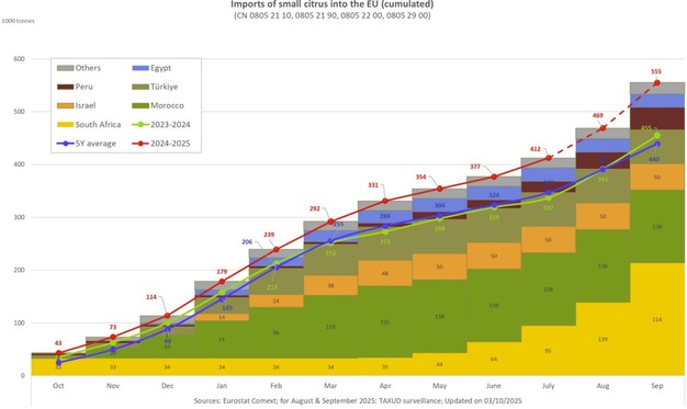 Small citrus imports increased strongly, reaching 555,155 tons compared to 482,189 tons in 2023/24 and a five-year average of 439,592 tons. South Africa was the largest supplier at 213,654 tons, while Morocco followed with 137,945 tons, more than 80% above last season. Türkiye shipped 64,120 tons, Peru 42,387 tons, and Egypt 25,374 tons.