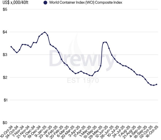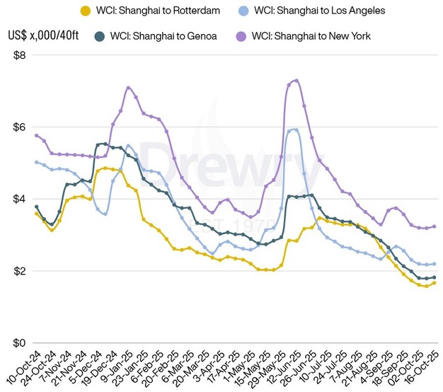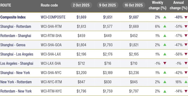 Spot rates on the Asia–Europe route showed modest increases this week: The rate from Shanghai to Rotterdam jumped 6% to $1,669 per 40ft container, and from Shanghai to Genoa rose 2% to $1,821. These increases follow an industry-wide effort by carriers that introduced new Freight All Kinds (FAK) rates effective 15 October to stop the market's post-Golden Week rate slump.