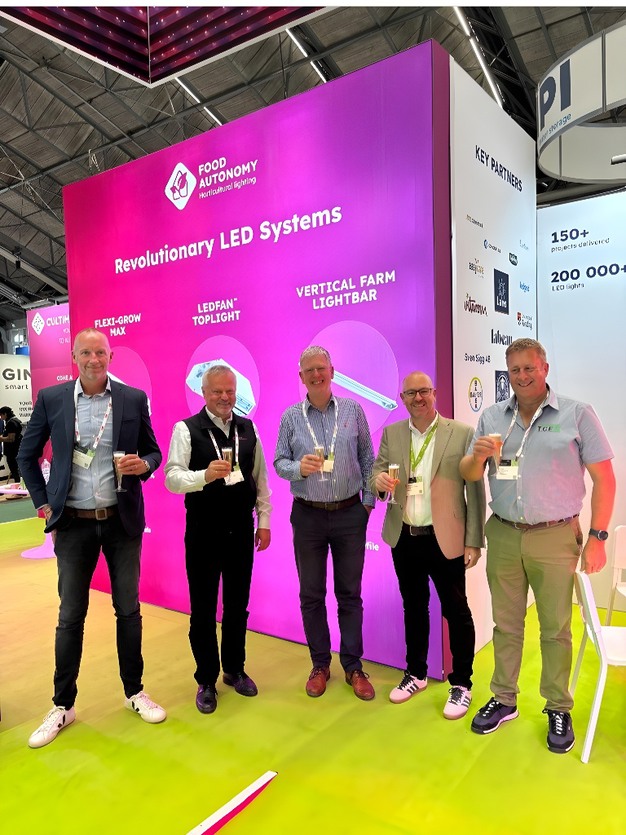 GreenTech 2025, from left to right: Keith Thomas – Commercial Director, Food Autonomy Lighting, Zoltán Sejpes – CEO, Food Autonomy Lighting, Phil Pearson – Group Development Director, APS Produce, Malcolm Yare – Commercial Director, TCE, and Tim Coats – Managing Director, TCE