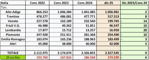 Regional trends show mixed results. South Tyrol reports a 2 per cent increase compared with last year, reaching 1,056,981 tons. Trentino registers an 8 per cent rise to 517,313 tons. Piedmont shows a 10 per cent decrease, while Veneto declines by 14 per cent, partly due to hail. In Veneto, 43 per cent of the crop is allocated to industry through dedicated programmes. Emilia-Romagna is down 3 per cent, Friuli shows a 10 per cent reduction, and Lombardy posts a 28 per cent increase.