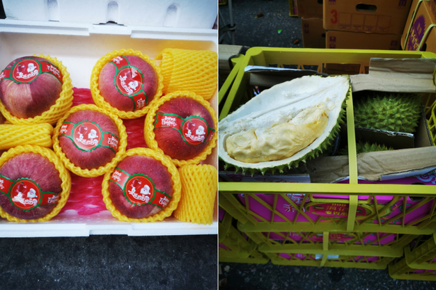 Left: Christmas-themed big apples; Right: Vietnamese Kanyao durians