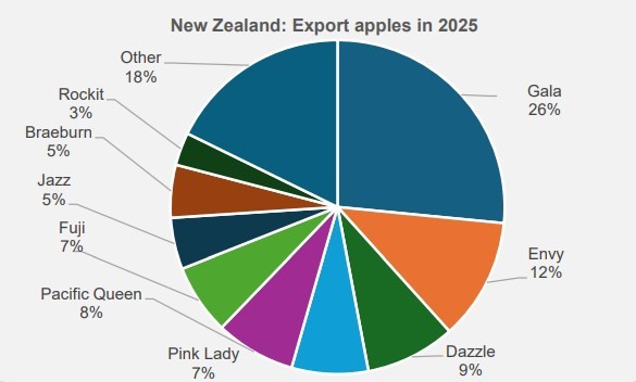 Gala is by far the most important apple variety exported by New Zealand, with 110,000 tonnes shipped. This was more than in the two preceding years, but lower than volumes seen earlier. Around 70% of Gala exports are destined for South and East Asia.
