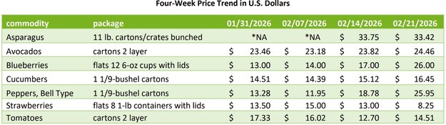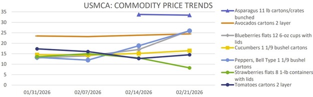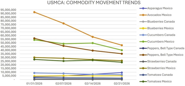Movement patterns across key fruit and vegetable categories remain mixed, with several items experiencing price adjustments amid variable supply conditions at U.S. crossings and ports of entry.