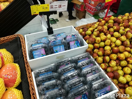 Courgettes were available in 500 gram packets sold at 13 Renminbi, while Chilean blueberries were sold at 32 Renminbi for a 125 gram punnet.