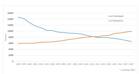 This year’s pear harvest amounts to 402 million kilograms, the apple harvest amounts to 269 million kilograms, according to area figures for apples and pears from the CBS (Statistics Netherlands). In the past year, the apple area continued to decrease by 350 hectares, while that of pears increased by 230 hectares. This has been a trend that’s been happening for 20 years. Between 1998 and 2018, the apple area decreased by more than 8,400 hectares, while that of pears increased by nearly 4,000 hectares. A turning point came in 2012, when the pear area became larger than the apple area.