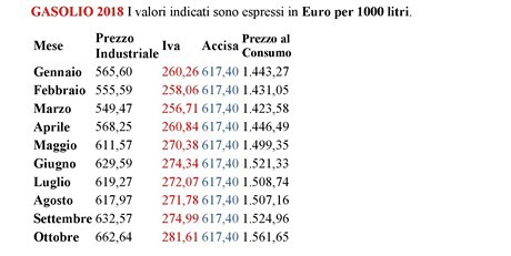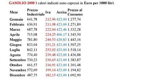 Notice that the excise duty, which is fixed, was €423 every 1000 liters in 2008. Over the years it increased to the current €617,40 every thousand liters. VAT plus excise duties are much higher than the industrial cost of diesel! The average global price at the pump is of €1200 every 1000 liters.