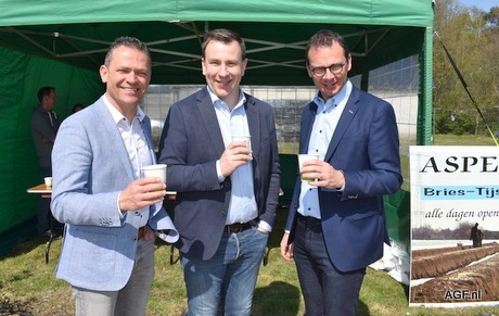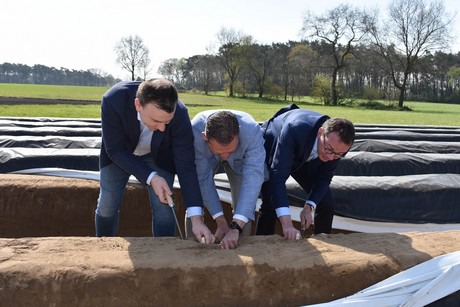 Last Tuesday the Belgian asparagus season was officially opened with the traditional first cut. The first cut this year was made by mayor of Peer Steven Matheï (CD&V), mayor of Leopoldsburg Wouter Beke (CD&V), mayor of Oudsbergen Lode Ceyssens (CD&V) and vice-president of Boerenbond Georges Van Keerberghen at asparagus grower Bries-Tijskens in Grote-Brogel.