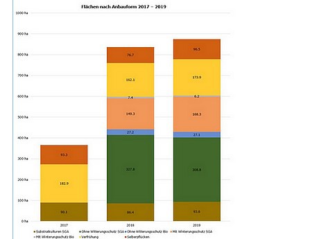 In Switzerland, strawberries are planted on 510 hectares (-0.3%) and the cultivated areas are quite constant. In order to secure the domestic supply, the area under protective covering has been increased. In 2019, 34.2% (174.5 ha) of the strawberry acreage is protected from the weather.