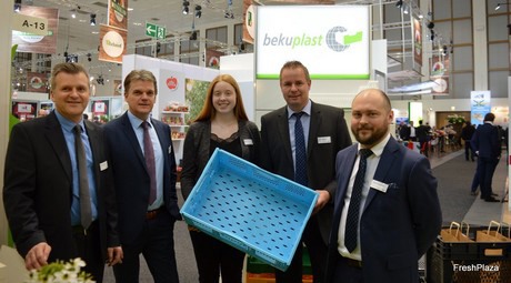 The bekuplast GmbH team at Fruit Logistica (l.t.r.): Jörg Kampherbeek, Jürgen Schultz, Melissa Zwartscholten, Georld Wilms, Grzergorz Czajkowski.