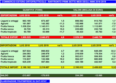 The Fruitimprese processing of Istat data concerning the first seven months of the year (July 218-July 2019) revealed that, despite the increase in exported volumes (4.8%), there was a 3.3% drop in value. Imports grew when it came to both volume (2.3%) and value (12%).