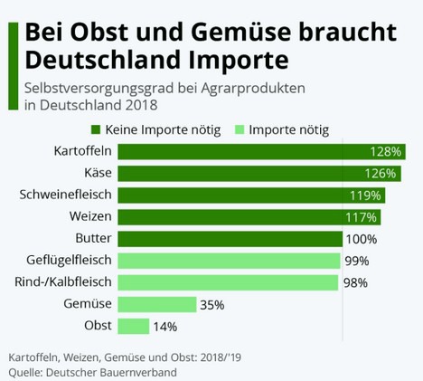 Particularly in the case of fruit and vegetables, however, the country is dependent on imports to meet demand. Here the so-called degree of self-sufficiency is below 100 percent. This means that imports from other countries are necessary to fill the shelves in the food retail trade. The chart thus also shows how important the free movement of goods between countries is - even in times of the Corona crisis.