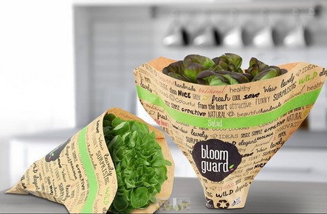 The bloom guard is made of waterproof paper without any coating. Leithe: "The paper does not remove moisture from the lettuce, so it's contents do not readily spoil. Paper breathes and creates optimal conditions for the packed lettuce. This means the lettuce retains its freshness at the POS."