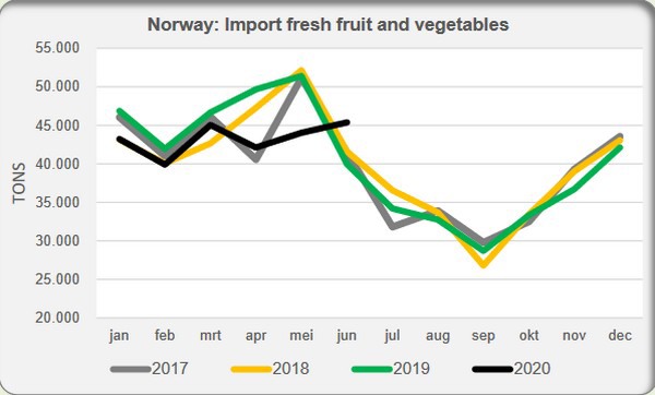 Norway imported less fresh fruit and vegetables in the first half of this year. These figures were down six percent on the same period in 2019. Compared to the first half of 2018, it was three percent lower. Imports lagged in, especially, April and May. In January, February, and March, the deficit was smaller. In contrast, in June, Norway imported considerably more than in previous years.
