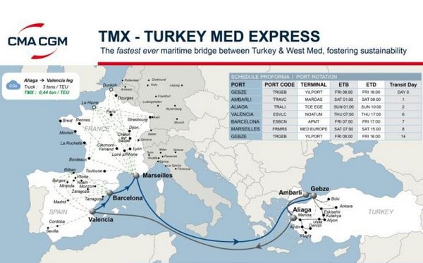 CMA CGM is pleased to announce the implementation of a new Shortsea Med service, the faster ever maritime bridge between Western Turkey & West Med: TMX – TURKEY MED EXPRESS starting as from Friday, September 18th, 2020 ex Gebze port.