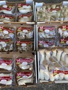 Right: Marchfeld organic king trumpet mushrooms in both large and small containers