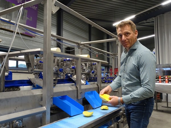 "The small version's yield results are also very good. There's little fruit loss. That's because the machine peels with peelers that follow the fruit's outline. Stoning with the bowl-shaped oscillating knives ensures that the fruit isn't damaged either. The machine can also cut the mango close to the pit," concludes Hans.