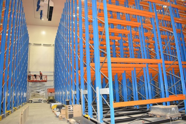 The new frozen storage consists of a front hall with 12 loading and unloading docks, a lock system and three freezer compartments. “We can load and / or unload an average of 80 containers per shift. The pallets that are unloaded receive an RFID tag and are placed on a treadmill where they can be wrapped and weighed. After that, the pallets go through the locks to the freezer cells and undergo additional checks, all of which are automatic. Three to 6 reach trucks drive in the freezer cells and place the pallets in the right place. The movable racks in the freezer cells are 16 meters high and the system works like a pharmacy cupboard. Thanks to RFID technology, which follows all internal steps of the pallets, the system knows exactly which pallets are arriving. Based on this, the movable racks open automatically while the cherry pickers picks up pallets from the treadmill. When the cherry pickers have arrived at the correct rack, they are already open, which saves a lot of time per day and in the long run avoids many so-called 'empty meters' with the cherry pickers, ”says Jakob.